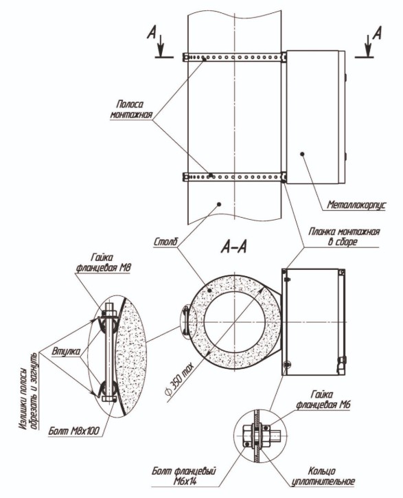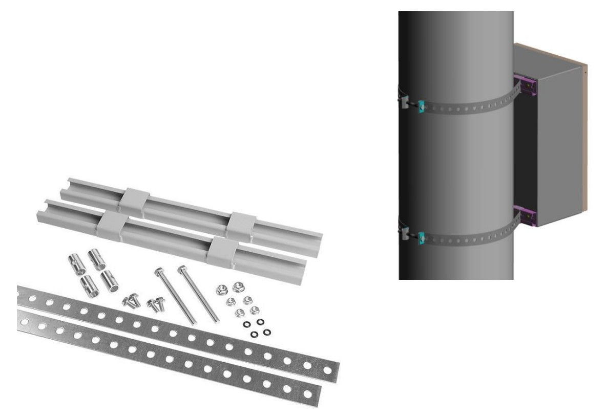 Комплект предназначен для монтажа металлических корпусов:- на железобетонных стойках типа СВ110 и СВ105 – крепление скобами;- на столбах круглого сечения диаметром до 350 мм – крепление монтажными полосами.