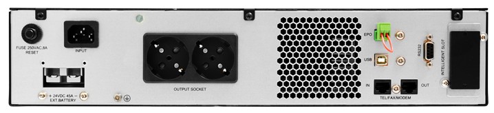 - широкий диапазон входного напряжения и частоты;- двойное преобразование напряжения (онлайн), выходное напряжение синусоидальной формы;- стабилизированное выходное напряжение с возможностью установки: 208/220/230/240 В;- защита от коротких замыканий, перегрузки по току, перегрева, от глубокого разряда батарей;- подключение внешних аккумуляторных батарей;- дистанционная настройка и мониторинг параметров через порты RS-232 и USB;- возможность дистанционного аварийного отключения нагрузки (функция EPO);- возможность подключение модуля SNMP либо карты сухих контактов;- жидкокристаллический дисплей, отображающий параметры входного и выходного напряжения сети, рабочую температуру, уровень нагрузки, уровень заряда аккумуляторных батарей, а также режимы работы ИБП;- универсальное исполнение корпуса позволяет вертикальную установку изделия, а также в 19" стойку.
