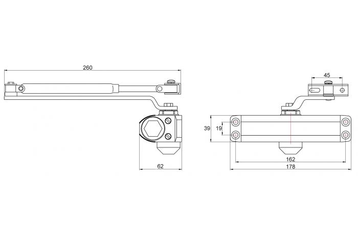 Доводчик для дверей весом до 65 кг, двухскоростной, установочный размер 162х19 мм, габариты 39×178×62 мм, -45...60°С, цвет - белый