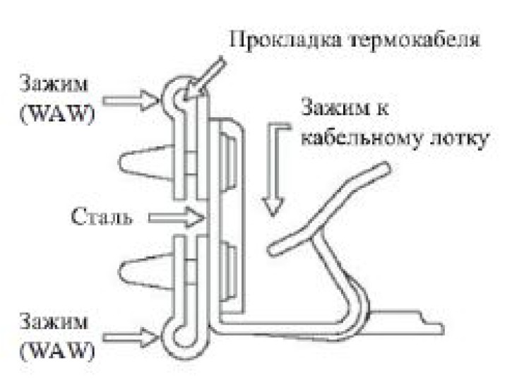 Предназначен для крепления термокабеля на балках и перекладинах толщиной 3,2...6,4 мм.Состоит из углового зажима WAW и кнопочной защелки.
