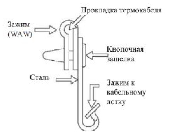 Монтажный зажим предназначен для крепления извещателя к кабельному лотку толщиной 1,6...4 мм.Состоит из стального зажима типа “Caddy”, держателя типа WAW и кнопочной защелки и предназначен для крепления линейного теплового извещателя по бокам кабельного лотка.