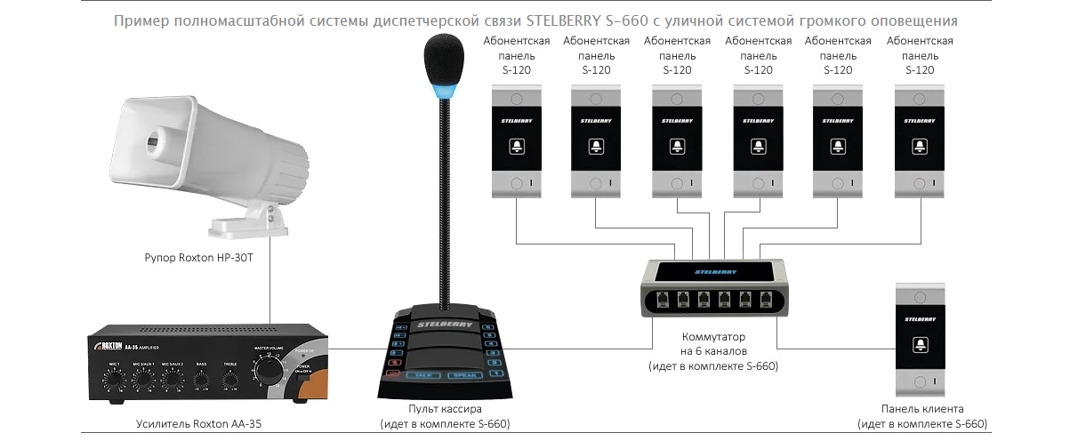 Это переговорное устройство, представляющее из себя мощную интегрированную систему для обеспечения полномасштабной связи на автозаправочных станциях. В пульте диспетчерской связи переговорного устройства для АЗС интегрированы функции клиент-кассир, громкого оповещения и возможность общения с любой из 4-х заправочных колонок при помощи дополнительных абонентских вызывных панелей STELBERRY S-120.