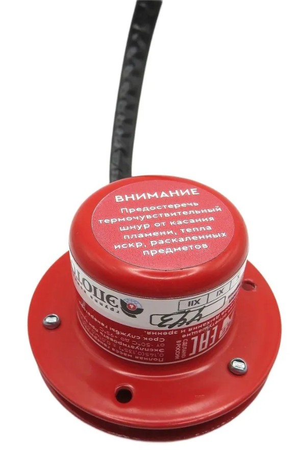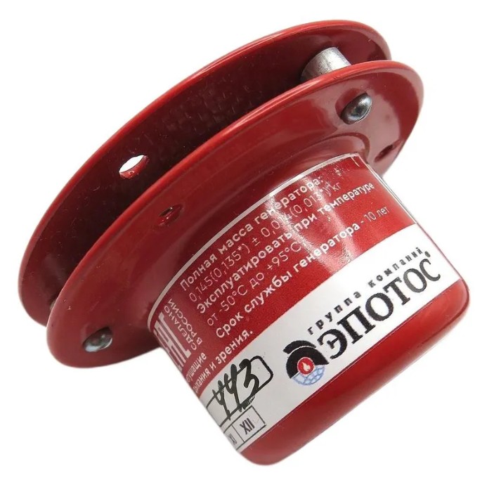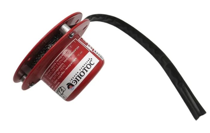Генератор огнетушащего аэрозоля с термошнуром, температура срабатывания 170°C, защищаемый объем 0.2 м³, инерционность срабатывания 5 сек, время подачи огнетушащего аэрозоля 2.5...5 сек, диапазон рабочих температур -60...+60°C, габаритные размеры 65х38 мм