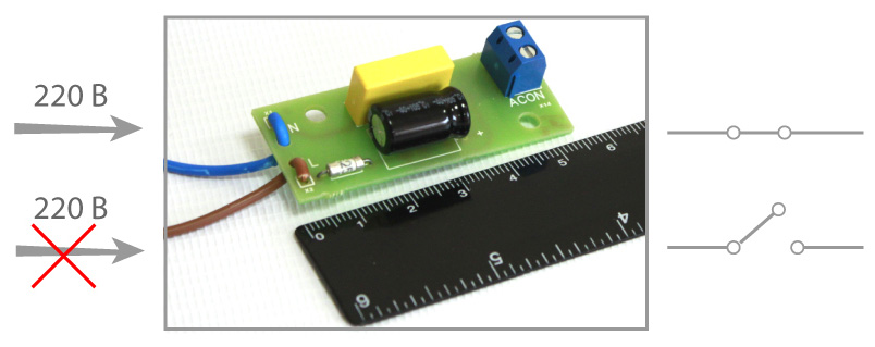Датчик представляет собой устройство для выдачи информационного сообщения о наличии напряжения в электрической сети в формате “СУХИЕ КОНТАКТЫ РЕЛЕ” и реализован в виде модуля с гибкими проводниками и выходной колодкой. Датчик подключается к электрической сети гибкими проводниками согласно фазировке. Выходные контакты выведены на клеммную колодку ACON. Датчик обеспечивает гальваническую развязку выходных контактов.