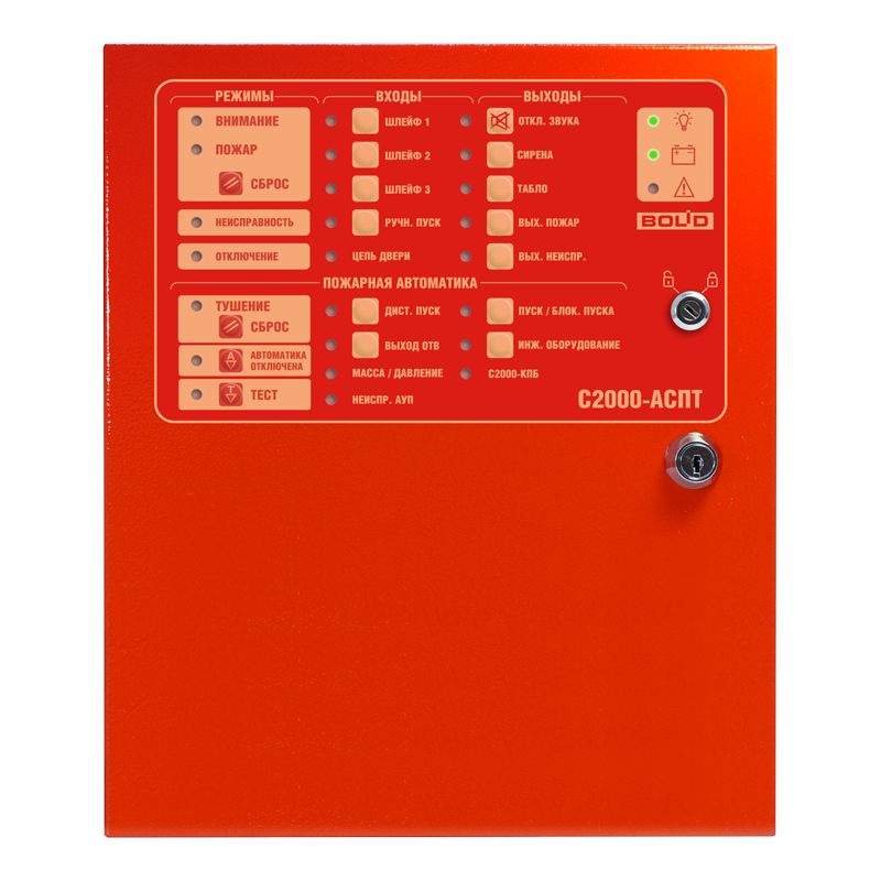 Блок приёмно-контрольный и управления автоматическими средствами пожаротушения «С2000-АСПТ» предназначен для работы в составе автоматической установки газового, порошкового или аэрозольного пожаротушения. Работа блока возможна только в ИСО «Орион» под управлением сетевого контроллера (пульта «С2000М») совместно с блоком индикации системы пожаротушения «С2000-ПТ».Блок предназначен для:− защиты одного направления пожаротушения;− управления автоматической установкой пожаротушения газового, порошкового или аэрозольного типов в автоматическом и дистанционном режимах;− приёма и обработки сигналов от автоматических и ручных пассивных, активных (питающихся по шлейфу) и четырёхпроводных пожарных извещателей с нормально-замкнутыми или нормально-разомкнутыми внутренними контактами;− управления звуковыми и световыми оповещателями. Данные оповещатели не являются оповещателями 1 и 2 типов;− управления инженерным оборудованием (отключением вентиляционных систем и др.);− приёма команд и передачи извещений по интерфейсу RS-485 на сетевой контроллер (пульт контроля и управления «С2000М»);− контроля исправности цепей управления автоматической установки пожаротушения, световых и звуковых оповещателей;− контроля исправности автоматической установки пожаротушения;− приёма извещений от:датчиков состояния дверей;сигнализаторов давления;выходов неисправности («масса» или «давление»);блоков контрольно-пусковых «С2000-КПБ»;устройств дистанционного пуска;− выдачи извещений «Пожар» и «Неисправность» на пульт пожарной части.