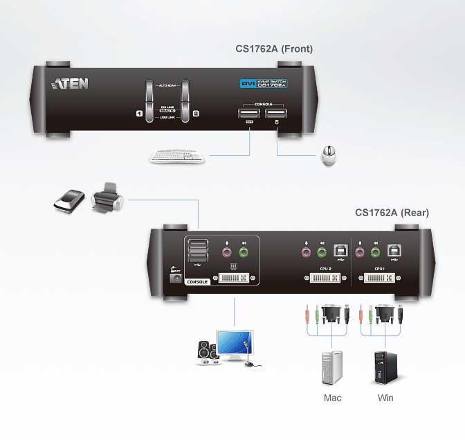 CS1762A-AT-G – KVMP Переключатель ATEN CS1762A CubiQ™ является представителем нового поколения KVM-переключателей (клавиатура, видео и мышь), объединяя в себе 2-портовый KVM-переключатель и 2-портовый USB 2.0-концентратор, и обеспечивая возможность подключения цифрового монитора (DVI).Кроме того, CS1762A поддерживает новую технологию Video DynaSync™ ATEN, которая оптимизирует разрешение экрана и определяет состояние питания, в результате чего при выключении одного компьютера CS1762A автоматически переключается на следующий включенный компьютер. Будучи KVM-переключателем, это устройство обеспечивает доступ к двум компьютерам с одной консоли с монитором, и клавиатурой и мышью USB.В качестве USB 2.0-концентратора, это устройство позволяет каждому компьютеру поочередно пользоваться любыми подключенными к концентратору периферийными устройствами.Характеристики ATEN CS1762A:- Одна USB-консоль управляет двумя компьютерами DVI и двумя дополнительными устройствами USB 2.0- Встроенный 2-портовый USB 2.0-концентратор- Полная совместимость со спецификацией USB 2.0- Выбор компьютера осуществляется кнопками на передней панели, горячими клавишами или мышью- Поддержка звука – полная поддержка низких частот обеспечивает высокое качество звучания при использования систем объемного звучания 2.1- Поддержка различных платформ – Windows, Linux, Mac и Sun- Поддержка широкоформатных разрешений- Высочайшее качество видеоизображения - 1920 x 1200- Независимое переключение фокуса KVM, USB и звука- Поддержка цифровых (DVI) и аналоговых мониторов – полная совместимость со спецификациями DVI- Поддержка HDCP- Video DynaSync™ – эксклюзивная технология ATEN, позволяющая оптимизировать разрешение и обойти проблемы с дисплеем при загрузке- Определение состояния питания - если один из компьютеров выключается, переключатель автоматически переключается на следующий включенный компьютер- Эмуляция/обход порта мыши поддерживает большинство драйверов мыши и многофункциональные мыши- Полная эмуляция клавиатуры для загрузки без сбоев- Поддержка и эмуляция* клавиатур Mac/Sun- Многоязычные клавиатурные раскладки - поддержка английской, японской и французской клавиатур- Режим автосканирования для слежения за всеми компьютерами- Возможность обновления прошивки* 1. Клавиатуры Mac/Sun эмулируются комбинациями клавиатуры ПК2. Клавиатуры Mac/Sun работают только с компьютерами этих фирм
