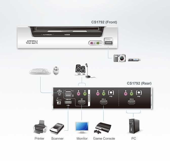 CS1792-AT-G – KVM Переключатель ATEN CS1792, совмещая в себе 2-портовый переключатель с 2-портовым USB 2.0-концентратором, обеспечивает быстрое переключение сигнала HDMI между 2 ПК или другими устройствами с поддержкой HDMI, такими как игровые консоли, и позволяет пользователям совместно использовать периферийные устройства USB с единой консоли.Переключатель CS1792 позволяет легко переключаться между устройствами при помощи кнопок на передней панели и горячих клавиш на клавиатуре, а также обладает функцией Video DynaSync™, обеспечивающий постоянное оптимальное разрешение для устройств HDMI. Кроме того, поддержка цифрового аудио позволяет CS1792 обеспечивать высококачественный звук, такой как Dolby True HD и DTS HD Master Audio.Уникальность конструкции и инновационные функции делают переключатель CubiQ™ CS1792 USB 2.0 HDMI KVMP™ стильным и функциональным дополнением для любой мультимедийной системы домашнего офиса.Переключатель CubiQ™ CS1792 является идеальным решением для мультимедийных систем дома и в офисе, и отличается не только малыми размерами, но и яркостью дизайна.Функциональные особенности ATEN CS1792:- 2-портовый переключатель HDMI USB 2.0 KVMP™- Одна USB-консоль управляет двумя компьютерами с интерфейсом HDMI и двумя дополнительными устройствами USB- Встроенный 2-портовый USB 2.0-концентратор; полная совместимость со спецификациями USB 2.0- Независимое переключение фокуса KVM, периферийных устройств USB и звука с помощью кнопок на передней панели и горячих клавиш- Поддержка цифровых мониторов HDMI – полная совместимость с HDMI; также поддерживается HDCP- Поддержка Dolby True HD и DTS HD Master Audio- Высочайшее качество видеоизображения – поддержка 480i, 480p, 720p, 1080i и 1080p(HDTV)/1920 x 1200(DVI)- Определение состояния питания - если один из компьютеров выключается, CS1792 автоматически переключается на следующий включенный компьютер- Поддержка широкоформатных разрешений- Поддержка различных платформ – Windows, Linux и Mac- Эмуляция/обход порта мыши поддерживает большинство драйверов мыши и многофункциональные мыши- Video DynaSync™ - хранит EDID (Extended Display Identification Data – расширенные идентификационные данные дисплея) монитора консоли для оптимизации разрешения- Полная эмуляция клавиатуры для загрузки без сбоев- Поддержка и эмуляция* клавиатур Mac- Режим автосканирования для слежения за всеми компьютерами и устройствами HDMI- Возможность обновления прошивки* 1. Клавиатуры Mac эмулируются комбинациями клавиатуры ПК2. Клавиатуры Mac работают только с компьютерами этих фирм