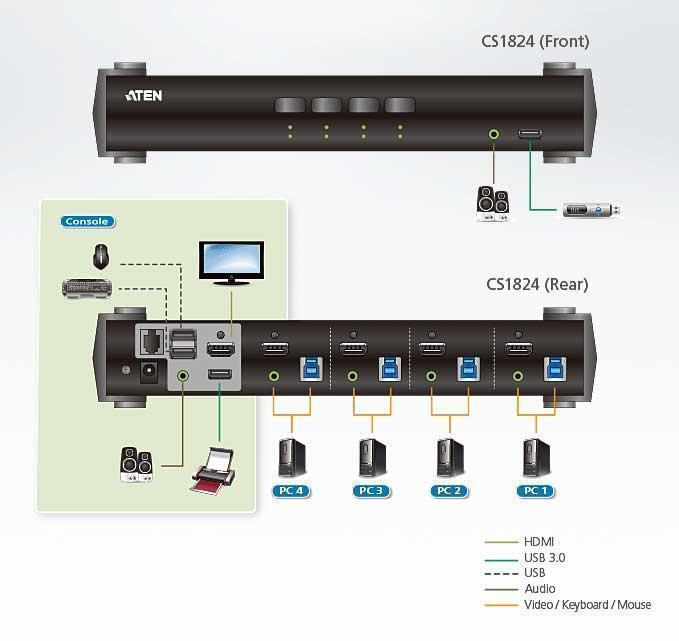 ATEN CS1824 KVMP™-переключатель, который позволяет с помощью одной USB-клавиатуры, мыши и HDMI-монитора осуществлять простое управление четырьмя компьютерами, оснащенными интерфейсом HDMI. Поддерживая высочайшее качество изображение вплоть до 4K DCI (4096 x 2160 при 60 Гц), KVMP™-переключатель CS1824 оптимизирует многозадачную работу пользователей.Благодаря запатентованной компанией ATEN технологии Video DynaSync™, пользователи могут наслаждаться наилучшим разрешением экрана и наиболее быстрым переключением между системами. Более того, поддержка режима default EDID дает возможность плавного включения, высококачественного отображения и устраняет проблему совместимости с мониторами.Кроме того, в CS1824 реализован режим микширования звука (Audio Mixer Mode), который смешивает для аудиовывода до двух источников звука. Это позволяет пользователям, даже если фокус KVM установлен на другом компьютере, получать уведомления, не пропуская никаких системных предупреждений. Наличие встроенного концентратора USB 3.1 Gen 1, обеспечивает скорость передачи данных до 5 Гбит/с, что позволяет ускорить работу с мультимедиа и с легкостью распределять для использования периферийные USB-устройства.Объединяя эти расширенные функции, KVMP™-переключатель CS1824 компании ATEN предоставляет уникальные преимущества для тех, кто занимается работой с компьютерной графикой, графическим дизайном, обработкой видео и во многом другом, где необходимо бесперебойное выполнение множества задач.Описание CS1824:- Возможность управления с помощью одной USB-клавиатуры и мыши четырьмя компьютерами с интерфейсами HDMI и совместного использования двух периферийных USB-устройств- Поддержка превосходного качество изображения – 4K UHD (3840 x 2160 при 60 Гц) и 4K DCI (4096 x 2160 при 60 Гц)- Поддержка Video DynaSync™ – эксклюзивной технологии компании ATEN, устраняющей проблемы с началом отображения и оптимизирующей разрешение при переключении между различными источниками- Встроенный 2-портовый концентратор USB 3.1 Gen 1 со скоростью передачи данных до 5 Гбит/с- Поддержка режима микширования звука (Audio Mixer Mode) - смешивает для аудиовывода до двух источников звука- Выбор компьютера с помощью кнопок на передней панели, комбинации клавиш с клавиатуры, мыши* и с использованием команд интерфейса RS-232- Поддержка режима ATEN default EDID – дает возможность плавного включения, высококачественного отображения и оптимизации разрешения для устранения проблем совместимости- Независимое переключение функций KVM, USB и стерео-звука**- Совместим с HDMI 2.0 и HDCP 2.2- Поддержка передачи звука высокого качества (HD)**- Определение состояния питания, подключенных компьютеров- Возможность обновления микропрограммы*Переключение портов мышью поддерживается только в режиме эмуляции мыши и только при использовании 3-кнопочной USB-мыши с колесом прокрутки.**Звук высокого качества (HD) не может быть переключен независимо при воспроизведении через HDMI.