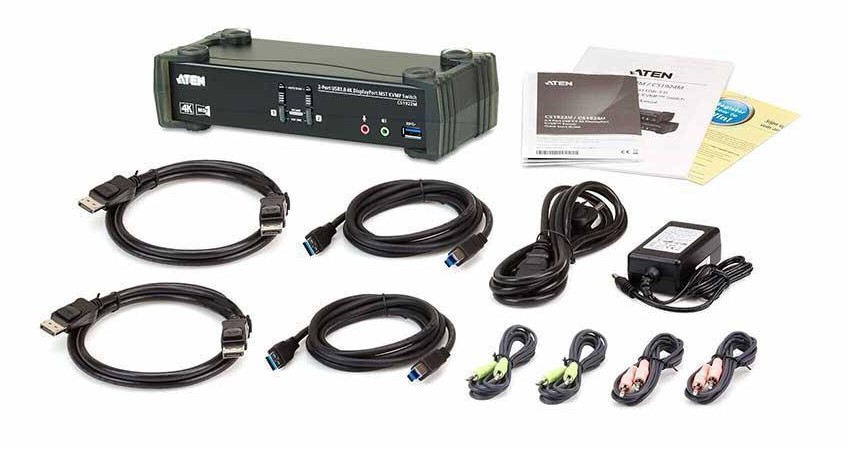 1x 2-портовый, USB 3.0, DisplayPort, KVMP™-переключатель с поддержкой 4K и MST2x кабеля DisplayPort 1.2 (1.5м /5 футов)2x кабеля USB (USB 3.0-A to USB 3.0-B; 1.8м/6 футов)4x звуковых кабеля (1.8м/6 футов)1x адаптер питания1x руководство пользователя