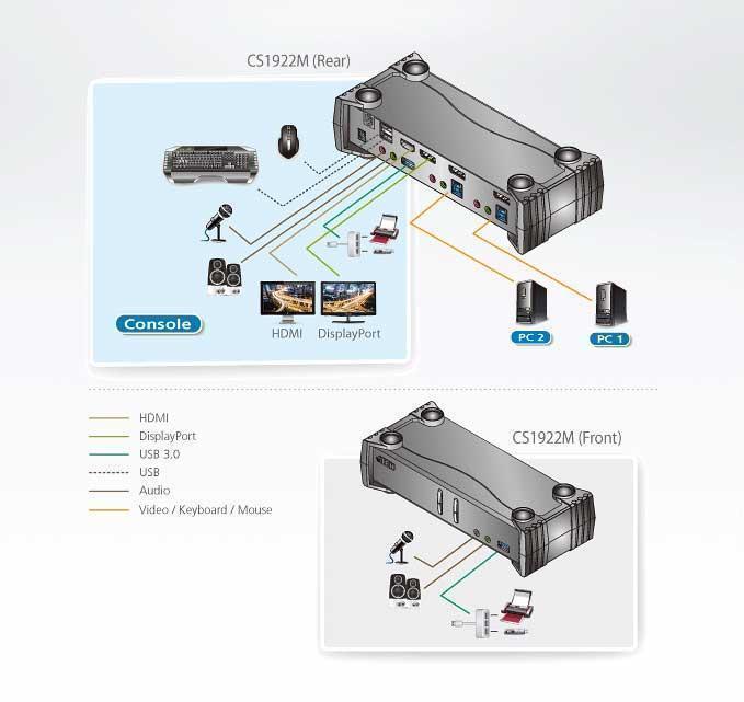 CS1922M-AT-G - 2-х портовый KVM Переключатель ATEN CS1922M с поддержкой USB 3.0 и 4K DisplayPort со встроенным концентратором MST с новейшей технологии Multi-Stream Transport. Обладая возможностями работы в режиме расширения изображения на два монитора (extended desktop mode) или вывода двух раздельных изображений (splitter mode) с разрешением уровня 4K с одного порта DisplayPort 1.2, KVMP™-переключатель CS1922M позволяет пользователям, обладающим двумя дисплеями организовать многозадачность, при этом уменьшив объемные кабельные соединения.Описание ATEN CS1922M:Первый в мире KVM-переключатель с DisplayPort и встроенным концентратором MST- Управление с единой консоли, оснащенной одной USB-клавиатурой/мышь и монитором с DisplayPort или HDMI, двумя компьютерами и двумя периферийными USB-устройствами- Встроенный концентратор Multi-Stream Transport (MST) позволяющий использовать два дисплея (с интерфейсами DisplayPort/HDMI), при подключении к одному источнику с портом DisplayPort *- Поддержка различных режимов работы - в режиме MST, режиме двух раздельных изображений (Splitter) и в режиме однопортового подключения.- Встроенный 2-портовый концентратор USB 3.1 Gen 1 со скоростью передачи данных до 5 Гбит/с- Поддержка режима DisplayPort Dual Mode (DP++) для вывода сигналов HDMI и DVI с помощью адаптера DisplayPort-to-HDMI/DVI DP++ ** -Возможность обновления микропрограммы- Поддержка "горячего" подключения - подсоединение/отсоединение компьютеров производится без выключения коммутатора Выдающиеся аудио/видео возможности- Превосходное качество изображения - 4K UHD (3840х2160 при 60 Гц) и 4K DCI (4096х2160 при 60 Гц)- Совместимость с DisplayPort 1.2 и HDCP- Поддержка передачи звука высокого качества (HD) через DisplayPort ***- Полная поддержка низких частот обеспечивает высокое качество звука при использования систем объемного звучания 2.1 Интеллектуальная работа- Выбор компьютера с помощью кнопок на передней панели, мыши ****, комбинации клавиш с клавиатуры и с использованием команд интерфейса RS-232- Независимое переключение функций KVM, USB и звука- Определение состояния питания - если один из компьютеров выключается, то CS1922M автоматически переключается на следующий компьютер- Режим автосканирования для отслеживания работы всех компьютеровУниверсальная совместимость- Функция эмуляции/обхода (bypass) клавиатуры поддерживает большинство игровых клавиатур- Функция эмуляции/обхода (bypass) порта мыши позволяет поддерживать большинство драйверов мыши и многофункциональные мыши- Поддержка нескольких платформ - Windows, Mac и Linux- Поддержка многоязычных клавиатурных раскладок - поддерживаются английская, японская, французская и немецкая клавиатураПримечание:* ПК используемый, как источник, должен быть совместим с DisplayPort 1.2.** Технология Dual-Mode DisplayPort technology (DP++) не требует активного адаптера для большинства применений с одним дисплеем. Рекомендуется использование активного адаптера DisplayPort, если Вы не уверены в совместимости видео источника с DP ++.*** Звук высокого качества (HD) при воспроизведении через DisplayPort не может быть переключен независимо.**** Режим переключения порта с помощью мыши поддерживается только в режиме эмуляции мыши и требует наличия 3-ех кнопочной (с колесом прокрутки) мыши с интерфейсом USB.