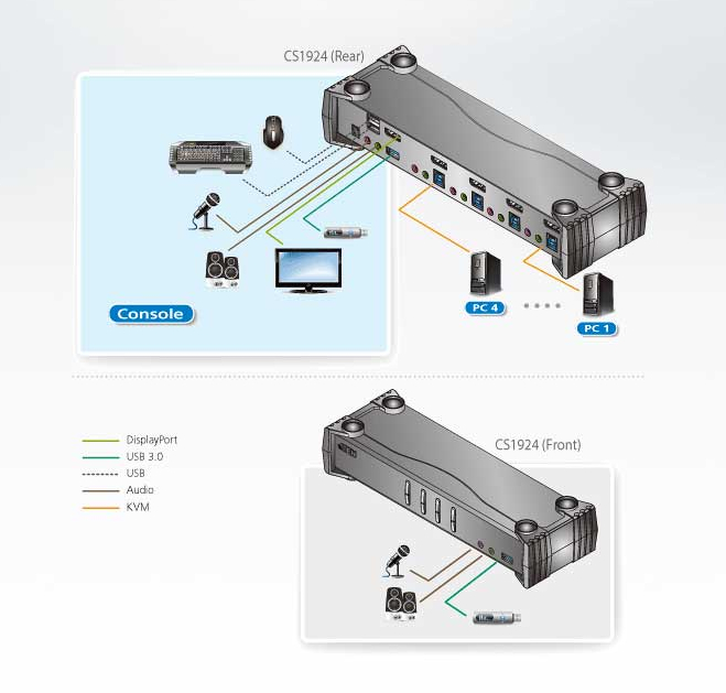 Позволяет пользователям получить доступ к четырем компьютерам с интерфейсом DisplayPort, используя консоль с одной USB-клавиатурой, USB-мышью и монитором.