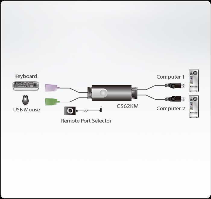 Кабельный KM-переключатель ATEN CS62KM позволяет управлять двумя компьютерами с помощью одной клавиатуры и мыши с интерфейсами USB. Для переключения между подсоединенными компьютерами CS62KM предлагает различные инновационные способы выбора порта: с помощью пульта дистанционного переключения, сочетания клавиш, курсора и колесика мыши. При переключении с помощью курсора мыши используется эксклюзивная технология Boundless Switching компании ATEN с интуитивно понятным способом переключения управления на другой компьютер – простым, без каких-либо ограничений перемещением курсора мыши через границу одного экрана на экран необходимого компьютера. Для плавной и беспрепятственной работы пользователя, реализованная в CS62KM функция Boundless Switching, поддерживает до 2 мониторов, ускоряя процесс переключения между компьютерами. Помимо повышения эффективности многозадачной работы с двумя дисплеями, эта функция особенно полезна в чрезвычайных ситуациях, требующих непосредственного отслеживания и управления компьютерами.Более того, одной из дополнительных возможностей CS62KM является режим питания по шине, означающий отсутствие необходимости во внешнем адаптере питания. Обладая богатым набором функций, KM-переключатель CS62KM предназначен для упрощения административных задач, экономии места, повышения производительности труда и особенно подходит для сложных многозадачных применений в разноотраслевых диспетчерских.Описание ATEN CS62KM- Управление двумя компьютерами с помощью одной клавиатуры и мыши с интерфейсами USB- Поддержка Boundless Switching (безграничного или бесконтактного переключения) – переключение управления клавиатурой/мышью с одного компьютера на другой достигается простым перемещением курсора мыши через границу экрана- Выбор компьютера с помощью пульта удаленного переключения, сочетания клавиш, курсора и колесика мыши*- Поддержка операционных систем семейства Windows- Не требуется установка программного обеспечения- Возможность обновления микропрограммы- Поддержка «горячего» USB-подключения- Питание по шине - не требуется внешний адаптер питания**Примечание:* Переключение портов мышью поддерживается только в режиме эмуляции мыши и только при использовании 3-кнопочной USB-мыши с колесом прокрутки.** Конструкция с питанием от шины USB позволяет KM-переключателю получать питание от подключенных компьютеров. Для получения достаточного питания требуется подключение к двум компьютерам.