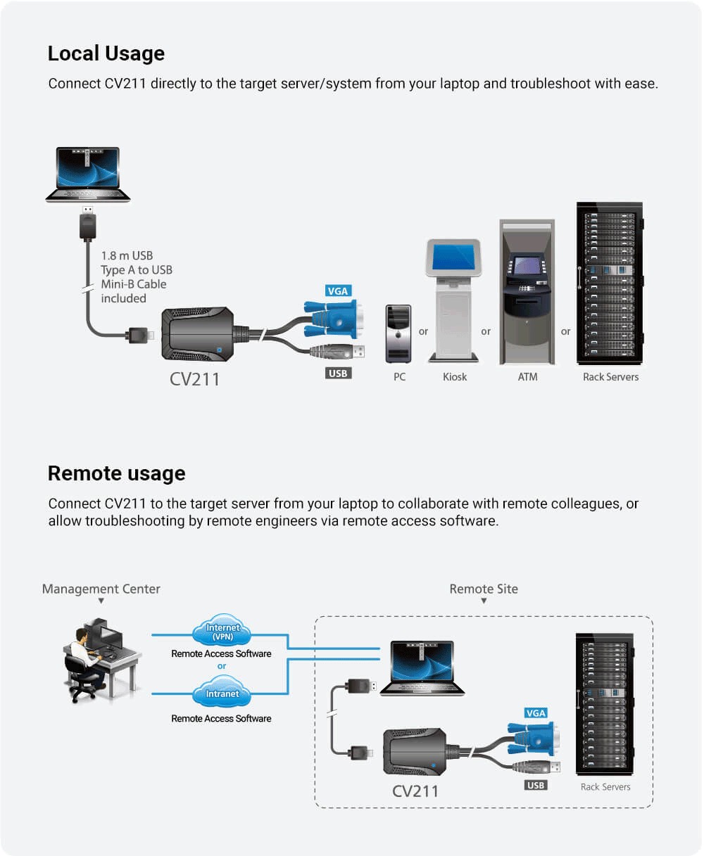 CV211CP-AT – USB-адаптер консоли на базе ноутбука ATEN CV211 предназначен для ИТ-специалистов, которым в первую очередь важна мобильность. Являясь идеальной заменой стационарному оборудованию для диагностики, он превращает Ваш ноутбук в KVM-консоль.При этом сочетает в одном компактном и удобном устройстве функциональность: кабель-адаптера для состыковки платформ, устройства захвата изображения, внешнего DVD-ROM, клавиатуры, мыши и монитора. Теперь Вы можете свободно, легко, быстро и профессионально проводить диагностику и устранять неполадки в серверах, банкоматах или PoS-системах.Описание ATEN CV211- USB-адаптер консоли для прямого соединения типа «ноутбук-компьютер»- Преобразует Ваш ноутбук в ультрамобильную консоль для серверов, компьютеров, терминалов и банкоматов- Поддержка функции работы с виртуальными носителями, позволяющей передавать файлы, проводить диагностическое тестирование, а также выполнять установку приложений и обновлений- Возможность обновления встроенной микропрограммы- Устраняет необходимость в тяжелом и громоздком оборудовании для устранения неполадок- Масштабирование рабочего стола - пользователь может регулировать размер/разрешение окна удаленного рабочего стола, исходя из размера или разрешения.Устранение неполадок на серверах и компьютерах- Мгновенный доступ на уровне BIOS обеспечивает возможность полного управления сервером во время сбоев оборудования и операционной системы- Двунаправленная передача файлов между ноутбуком и управляемым компьютером- Возможность записи видео и захвата изображений выполняемых удаленно действий для дальнейшего изучения и устранения неполадок- Поддержка функции Mouse DynaSync™ – автоматическая синхронизация перемещений указателя мыши на ноутбуке и управляемом компьютере- Экранная клавиатура с поддержкой нескольких языков- Поддержка макросов «горячих клавиш» - возможность установки нажатий клавиш, выполняющих определенные действия на целевом компьютере, для точного и эффективного выполнения задачПростота использования- Поддержка режима Plug-and-Play – не требуется установка программного обеспечения- Панель инструментов помогает пользователям легко работать со всеми функциями, вызываемыми в один щелчок из панели управления в окне удаленного просмотра- Регулируемые настройки видео для оптимального изображения и производительности- Конструкция с питанием по USB-шине с поддержкой «горячего» подключения- Максимальное удобство- Встроенные кабели для VGA и USB-клавиатуры/мыши- Уникальный дизайн кабельного зажима, позволяющего контролировать кабели- Поддержка аналогового видео с разрешением до 1920 х 1200 @ 60 Гц- Компактность и удобность при переноске - размер в пол-ладони
