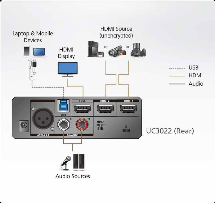 ATEN UC3022 CAMLIVE™ PRO предназначен для легкого смешивания двух подключенных камер 4K в формате FHD и потоковой передачи для мировой аудитории с выдающимися видеоэффектами и замечательным качеством изображения. Это устройство захвата видео сочетает в себе захват видео, кодирование и 2-канальное переключение источника видео с камер HDMI и профессионального линейного аудиоустройства. Это помогает прямой трансляции стать уникальной и выделиться из тысяч. CAMLIVE™PRO поддерживает переключение между несколькими подключенными источниками и комбинирует их для богатой передачи информации в процессе прямой трансляции. Кроме того, оно автоматически преобразует источники в видео формата 720P или 1080P, которое отправляется на ваш смартфон по USB.CAMLIVE™PRO предоставляет интуитивно понятное приложение ATEN OnAir Lite. Это приложение помещает все, что вам нужно, чтобы настроить свой видеопоток, прямо у вас под рукой. Комбинируйте, обрезайте и масштабируйте видео, чтобы создать выдающиеся макеты PnP. Предустановите до 8 пользовательских сцен и управляйте аудиоисточниками с помощью интуитивно понятного интерфейса сенсорной панели. Откройте для себя целый мир возможностей, используя хромакей - меняйте фон сногсшибательными эффектами.Обеспечивая плавную потоковую передачу видео с двух камер, CAMLIVE™PRO позволяет любому стримеру вести через интернет более качественную прямую трансляцию на основные стриминговые сервисы, такие как: YouTube Live, Facebook и Twitch. Независимо от того, занимаетесь ли вы съемкой, редактированием или потоковой передачей, CAMLIVE™ PRO достаточно гибок, чтобы соответствовать всем независимым потоковым вещательным средам. Этот микро-прибор содержит несколько функций в одном, а компактный дизайн позволяет принести его на любое живое мероприятие. С помощью всего лишь CAMLIVE™PRO, приложения-компаньона и вашего ноутбука/смартфона вы сможете представить привлекательную прямую трансляцию, которая будет соперничать с самыми продвинутыми стримерами в социальных сетях.