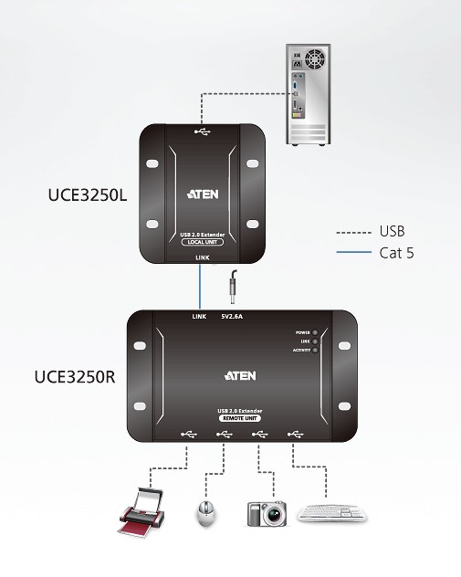 UCE3250-AT-G – 4-портовый USB 2.0 Удлинитель по Cat 5 ATEN UCE3250 является быстрым и гибким решением для промышленных применений благодаря прочному металлическому корпусу, высокому качеству передачи, компактному размеру и возможности настенного монтажа.С помощью кабеля Cat 5/5e/6 к удлинителю UCE3250 может быть подключено до 4-х периферийных USB-устройств, таких как флеш-накопители, клавиатуры, мыши, веб-камеры, сканеры или принтеры на расстоянии до 50 метров от компьютера.UCE3250, служащий в качестве USB-удлинителя а также USB-концентратора, состоит из локального UCE3250L и удаленного UCE3250R модулей. Для достижения лучшей совместимости и сохранности целостности данных на больших расстояниях удлинитель UCE3250 выполняет пакетную передачу сигналов данных. Подключаемый к удаленному модулю UCE3250 блок питания позволяет обеспечить достаточную мощность для любого типа удаленных USB-устройств.Характеристики UCE3250-AT-G- совместимость с High-Speed USB 2.0 и поддержка скорости передачи данных до 480 Мбит/с- увеличение расстояния передачи USB-сигнала до 50 метров с помощью кабеля Cat 5/5e/6- возможность подключения до 4 периферийных USB-устройств всех типов - флеш-накопители, клавиатуры, мыши, веб-камеры, сканеры, принтеры и многое другое- наличие металлического корпуса с возможностью настенного крепления, подходящего для промышленного применения- совместим со всеми основными операционными системами: Windows®, OS X® и Linux®- подключение в режиме "plug-and-play"