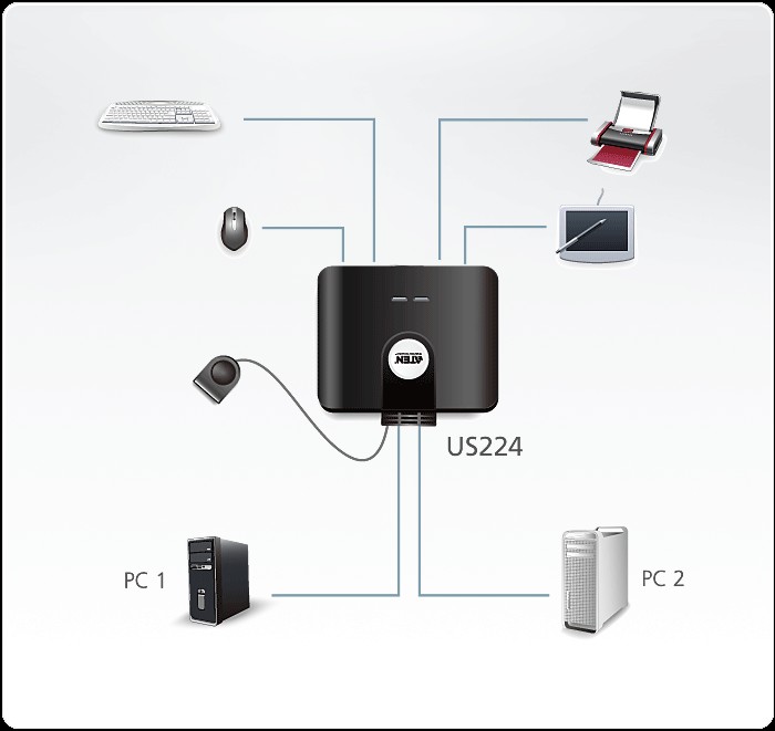 US224-AT – USB Переключатель ATEN US224 позволяет 2 компьютерам совместное использование 4 USB-устройств: клавиатуры, мыши и до двух периферийных устройств. Это исключает дополнительные затраты на приобретение USB-периферии для каждого компьютера. Конструкция переключателя «все-в-одном» помогает избежать проблемы спутанных проводов: не нужно подключать 2 отдельных USB-кабеля к компьютеру.Для дополнительного удобства переключатель имеет внешний порт удаленного управления для более комфортного распределения места на рабочем столе. С помощью порта возможно выбирать, какой компьютер необходимо использовать с USB-устройствами. US224 – это идеальный способ общего использования USB-устройств в мультимедийной среде офиса.Характеристики ATEN US224:- 4 USB-порта: конструкция «все-в-одном» решает проблему спутанных кабелей- позволяет 2 компьютерам использовать 4 USB-устройства: клавиатура, мышь и до двух периферийных устройств- простой выбор порта с помощью удаленного управления для удобного размещения переключателя на рабочем месте- совместимо с USB 2.0- поддержка различных платформ: Windows, Linux, Mac и ВС- светодиодная индикация выбранного порта- защита от перегрузки- не требуется адаптер питания (поддерживается питанием от USB)- поддержка «горячей замены»