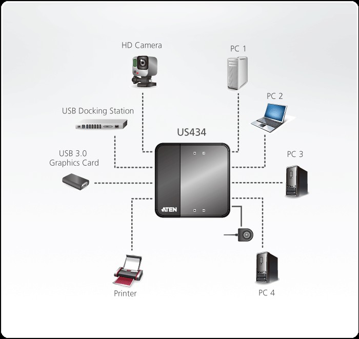 US434-AT– USB 3.0 Переключатель ATEN US434 позволяет 4 разным компьютерам совместно использовать четыре USB-устройства. Переключатель US434 совместимо со стандартом USB 3.0, обеспечивающим передачу данных со скоростью до 5 Гбит/с, и обратно совместимо со стандартами USB 2.0 и USB 1.1. Оно идеально подходит для устройств, которым нужна высокая пропускная способность, таких как док-станции или HD-камеры, подключаемые через порты USB.Кроме того, US434 поддерживает внешний дистанционный переключатель портов, который высвобождает место на рабочем столе и позволяет выбирать, какому компьютеру нужно использовать USB-устройства. Благодаря компактной универсальной конструкции, это устройство позволяет на небольшом пространстве создать удобное и высокопроизводительное рабочее место.Характеристики ATEN US434:- позволяет 4 компьютерам совместно использовать 4 устройства с портами USB 3.0- простой выбор портов с помощью дистанционного переключателя портов позволяет установить переключатель в удобном месте- совместимо со стандартом USB 3.0 и поддерживает скорость передачи данных до 5 Гбит/с- светодиодные индикаторы показывают, какой компьютер сейчас активен- защита от сверхтоков- поддержка разных платформ – Windows, Linux и Mac- питание от шины- гнездо питания micro USB для дополнительного источника питания- возможность горячего подключения; не требуется никаких драйверов или программного обеспечения