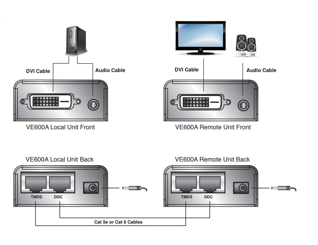 VE600A-A7-G – Видео Удлинитель ATEN VE600A с поддержкой звука позволяет увеличить расстояние между дисплеем DVI и источником DVI с помощью кабелей Cat 5e до 60 метров. Использование кабелей Cat 5e является простым и надежным способом подключения, при котором используется система кабельной разводки, применяемая в большинстве современных офисных зданий. В удлинителе VE600A используется специальная технология ATEN, позволяющая передавать аудио-/видеосигнал по одному кабелю Cat 5e. Если требуется поддержка дисплеев с расширенной системой идентификации, просто добавьте второй кабель Cat 5e. Благодаря поддержке стереозвука и популярных широкоэкранных форматов удлинитель VE600A обеспечивает кристально-чистое качество изображения и звука в любых системах, где требуется использование удаленных дисплеев DVI.Характеристики ATEN VE600A:- увеличение расстояния между источником DVI и дисплеем DVI- передача на большое расстояние – до 60 м- для подключения локального и удаленного устройств используется кабель Cat 5e- технология EDID компании ATEN позволяет передавать данные по одному кабелю Cat 5e- высочайшее качество видеоизображения – до 1920x1200 (40 м); 1080p (40 м); 1080i (60 м)- поддержка звука- эквалайзер для регулировки усиления/компенсации сигнала- поддержка широкоэкранных форматов- возможность монтажа в системную стойку- совместимость с HDCP
