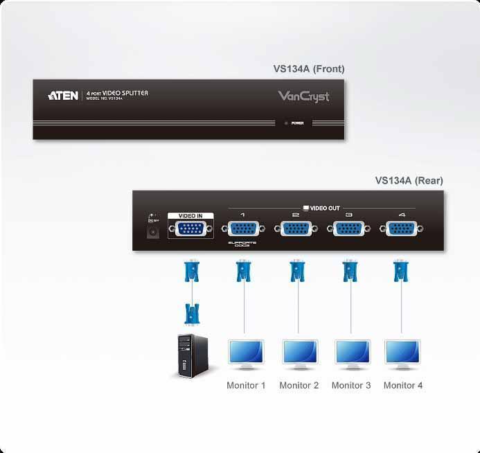 VS134A-A7-G – Видео Разветвитель ATEN VS134A дублирует видеосигнал от одного источника на 4 устройства отображения (мониторы, проекторы).Одновременно VS134A усиливает сигнал, что увеличивает дальность передачи на расстояние до 65 м. Трехуровневое каскадирование видеоразветвителей обеспечивает возможность трансляции изображения с одного источника на 64 устройства отображения.Разветвитель VS134A – лучший выбор для передачи нескольких сигналов VGA, XGA, SVGA, UXGA, QXGA или Multisync высокого качества на большие расстояния.Может применяться в таких областях как:• Финансы – удаленное отображение информации о рынке ценных бумаг• Образование – удаленное отображение лекций и уроков в аудиториях и классах• Бизнес – удаленное отображение в переполненных помещениях; видеоконференции; демонстрацииХарактеристики ATEN VS134A:- Один видео вход – на 4 видео выхода- Диапазон частот - до 450 МГц- Возможно создание каскадов до 3 уровней – подключение до 64 видеосигналов- Передача на большое расстояние – до 30 м *- Высочайшее качество видеоизображения – до 2048 x 1536- Поддержка мониторов VGA, XGA, SVGA, UXGA, QXGA и Multisync.- Встроенный усилитель на 1,5 ГГц позволяет видеосистеме поддерживать высочайшее качество- Цельнометаллический корпус