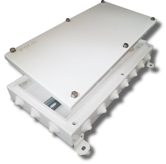 Корпус коробки имеет двойную защиту от коррозии (гальваническое покрытие и покраска). Крышка прижимается к корпусу через силиконовую прокладку. Винт крепления крышки снабжен уплотняющей тарельчатой шайбой с фторопластовым покрытием. Внутри корпуса коробки установлены керамические клеммные колодки, обеспечивающие соединение "под винт", и клемма заземления «РЕ». В боковых стенках устанавливаются втулки уплотнительные IP54 мембранного типа. Крепление коробки к элементам конструкций рекомендуется осуществлять с применением винтов или саморезов на металлические дюбели.Используются на улице и внутри помещения (IP54), обеспечивают механическую защиту и защиту от грызунов. Обеспечивают огнестойкое соединение кабелей с пределом FR 120 минут и более при температурном воздействии 750...800°ССертификационными испытаниями подтверждено сохранение работоспособности до температуры 1020°С при напряжении 300 В (с учетом требований п.4.8 СП6 испытания проводились по ГОСТ Р 53316).
