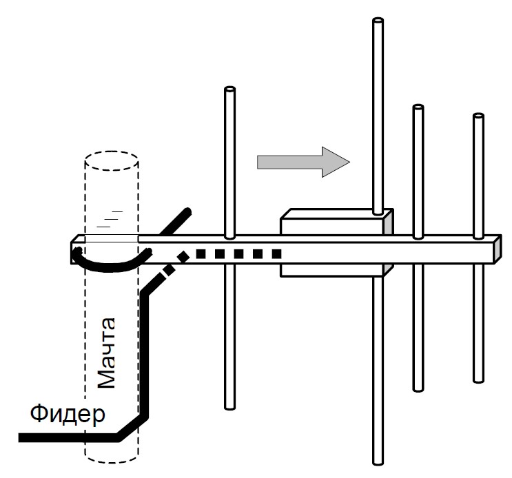 Модификация с впаянным фидером. Длина фидера 3 м.Антенна обеспечивает при передаче в выбранном направлении усиление около 7 дБ, что эквивалентно увеличению мощности передатчика в 5 раз и дальности передачи на открытой местности в 2-2,5 раза.Направленная антенна может использоваться в качестве приемной, если сигналы должны приниматься только с одного направления. Например, если к приемнику RS-200R, который работает с одним передатчиком RS-200T, вместо антенны АШ-433 подключить антенну АН7-433, то дальность приема на открытой местности увеличится еще в 2-2,5 раза (если антенны размещены на достаточной высоте).