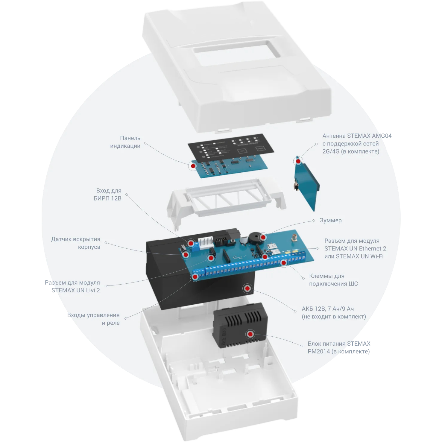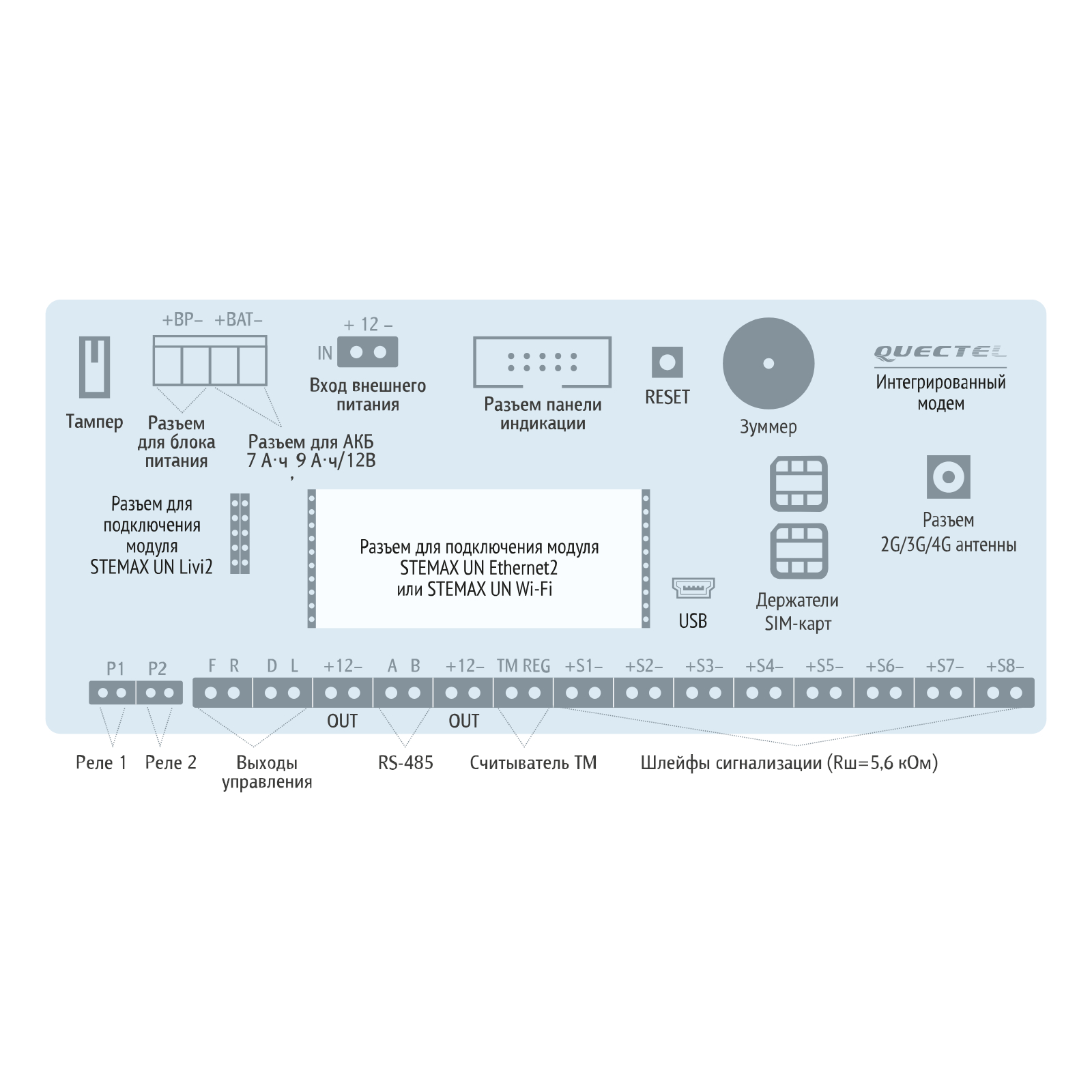 - поддержка стандартов сотовой связи 2,5G (GSM/GPRS), 3G (UMTS/HSPA+) и 4G (LTE)- 8 собственных охранно-пожарных шлейфов сигнализации- 8 собственных логических разделов - расширение до 158 ШС и 15 разделов за счет сетевых панелей STEMAX ZE10- подключение радиоустройств Livi за счет модуля STEMAX UN Livi 2- дополнительные каналы связи за счет модулей STEMAX UN Ethernet 2 и STEMAX UN Wi-Fi 2- питание основное 100–264 В, резервное от АКБ 7 А⋅ч, 9 А⋅ч / 12 В