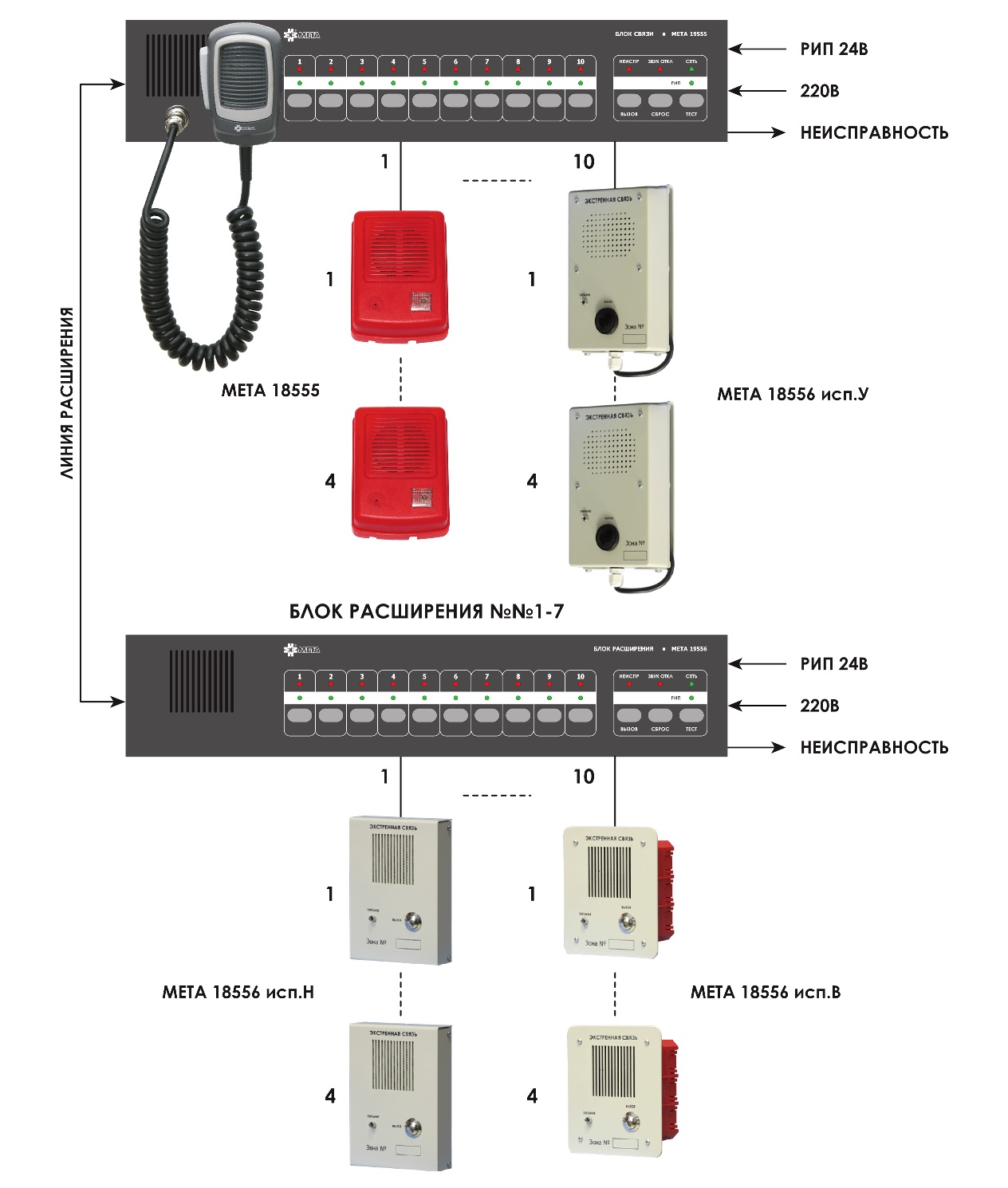 Состав системы:● Блок связи МЕТА 19555● Блок связи МЕТА 17555● Блок расширения МЕТА 19556● Блок расширения МЕТА 17556● Абонентское устройство МЕТА 18556 исп. В