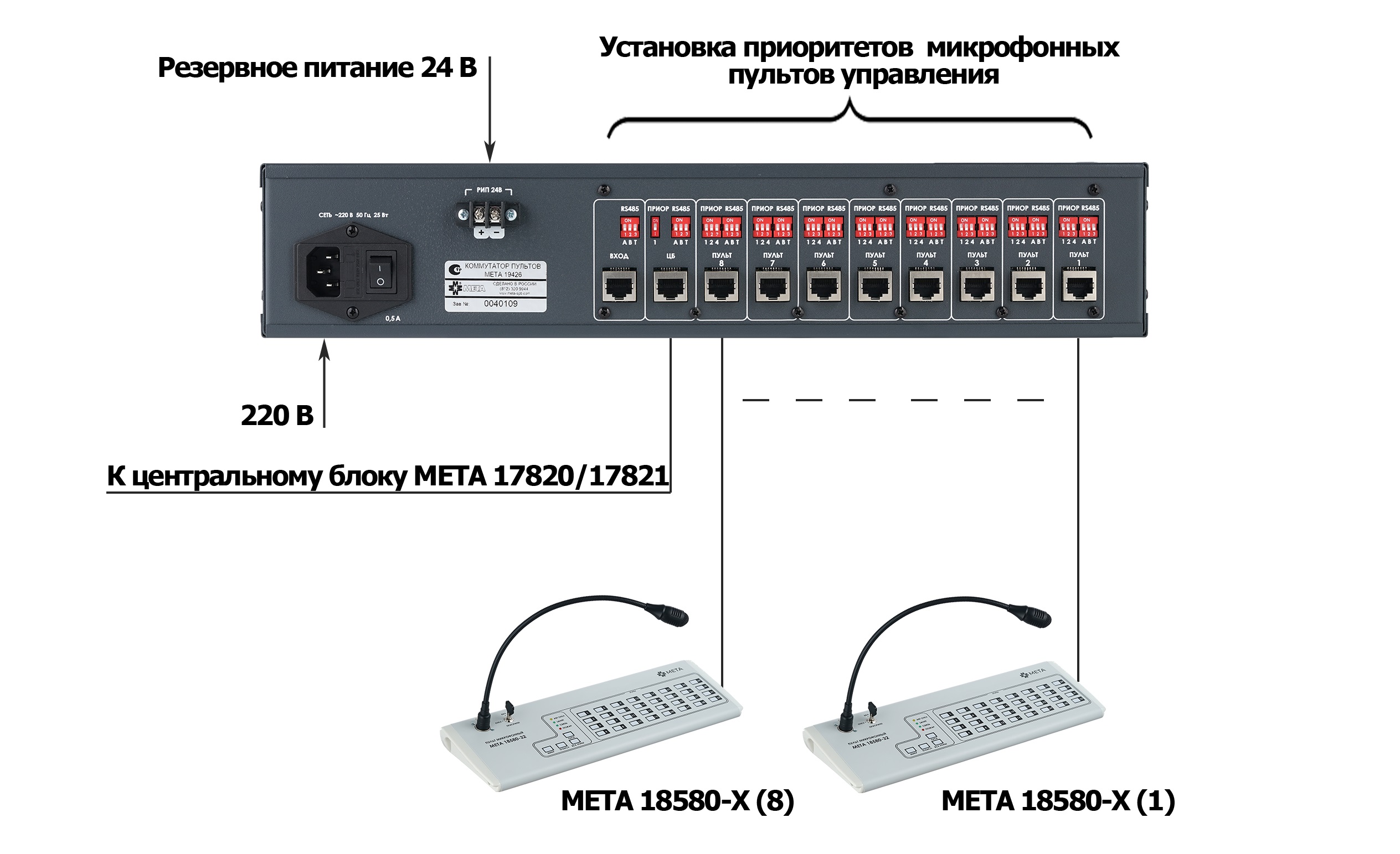 ● Длина линии связи между МЕТА 19426 и пультами не более 500 м.● Количество устанавливаемых уровней приоритета для каждого пульта - 8● Резервное питание 24 В● Диапазон передаваемых частот сигнала микрофона 100‑10 000 Гц