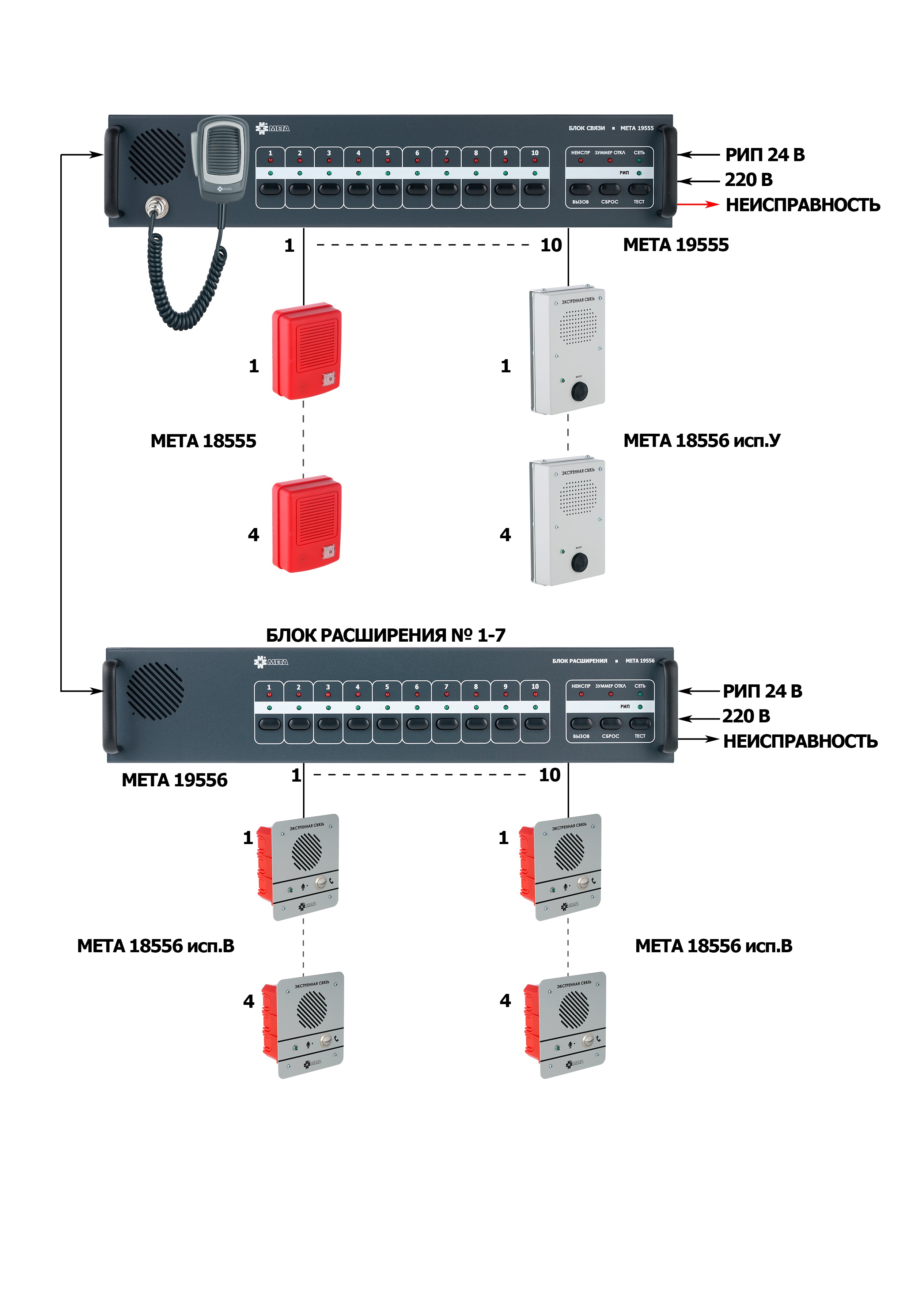 (231523) МЕТА 18555 (красный) Вызывная панель системы обратной связи, накладная (534724) МЕТА 18556 исп. В Вызывная панель системы обратной связи врезная, металл (544724) МЕТА 18556 исп. Н Вызывная панель системы обратной связи накладная, металл. (554724) МЕТА 18556 исп. У Вызывная панель системы обратной связи для уличного монтажа IP65 (221523) МЕТА 19556 Блок расширения системы обратной связи на 10 каналов. (602522) Источник резервного электропитания 24В, 2,5А. (450800) Аккумулятор 12В, 12А/ч (надо 2шт)