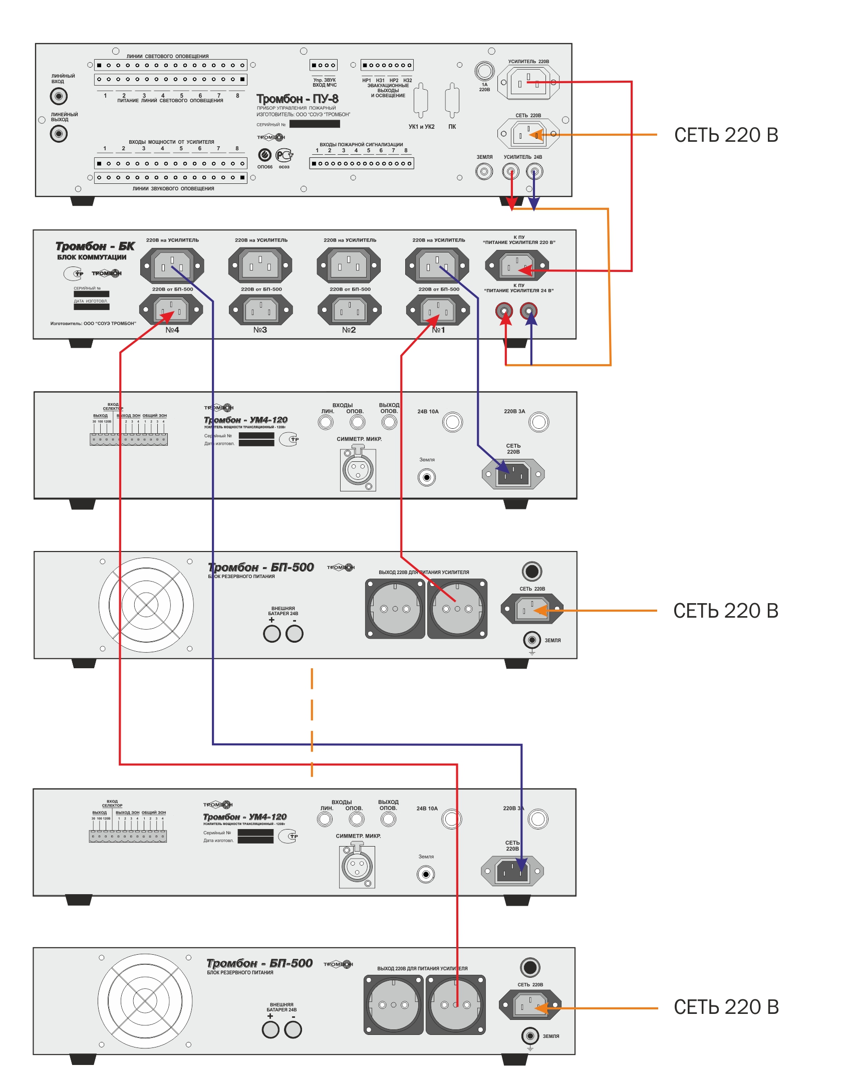 Блок коммутации для управления питанием усилителей. При построении СОУЭ одного усилителя мощности бывает недостаточно. Необходимо включение нескольких усилителей («каскадирование»). Блок коммутации «Тромбон – БК» предназначен для управления питанием нескольких усилителей мощности. Блок коммутации «Тромбон – БК» обеспечивает подключение питающего напряжения ~220 В 50 Гц.