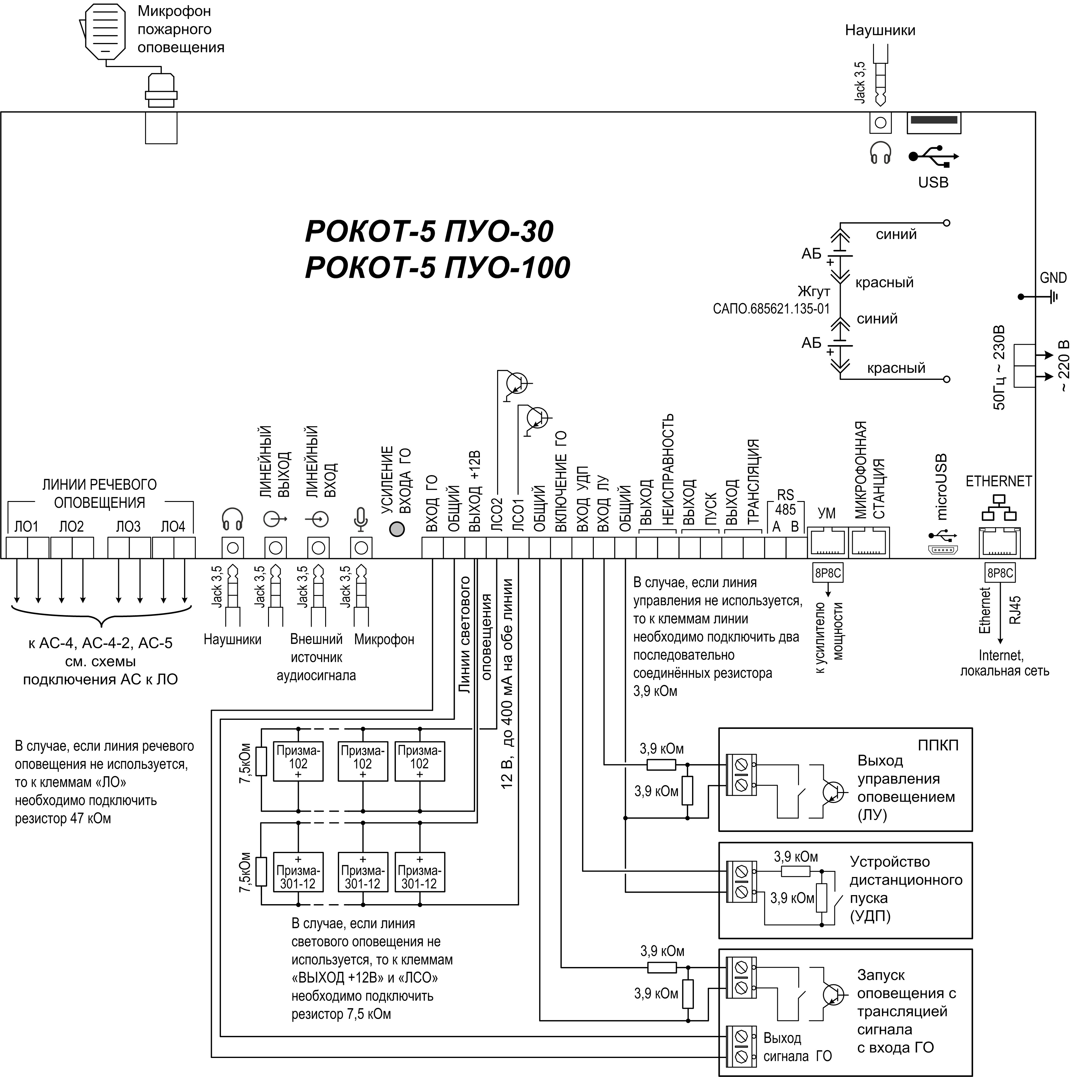 - До 4 усилителей мощности «Рокот-5 УМ-100» можно подключить к одному ПУО;- 4 Линии оповещения;- Сумарная мощность каждой линии оповещения не более 100Вт, но выходная мощность прибора 200Вт;- При подключении сторонних акустических систем к линии оповещения «РОКОТ-5» НУЖНА плата согласования, максимальная мощность которой не более 10 Вт;- Синхронное речевое оповещение ПУО и УМ;- Цифровая линия управления;- Четыре выхода подключения линий речевого оповещения с индивидуальной защитой от перегрузки;- Два выхода подключения линий светового оповещения защищённых от перегрузки;- Автоматический контроль исправности линий речевого оповещения и линий светового оповещения с переходом в режим «Неисправность» при обрывах и коротких замыканиях;- Наличие релейных выходов сигналов «Неисправность» и «Пуск» для передачи их на пожарный пульт централизованного наблюдения;- Встроенный источник резервного питания – аккумуляторные батареи;- Автоматический переход на питание от АБ при отключении сети 220 В, и обратно, при восстановлении питания 220 В;- Контроль наличия АБ и защиты АБ от глубокого разряда;- При наличии сетевого напряжения усилитель подзаряжает АБ в буферном режиме.