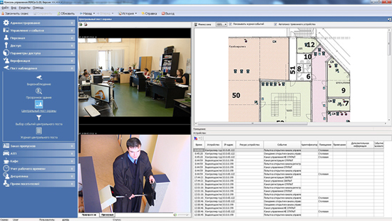 Раздел «Центральный пост» • отображение информации о состоянии объектов на графических планах предприятия и в табличном виде • отображение изображения с камер видеонаблюдения • управление устройствами, расположенными на графическом плане предприятия • контроль доступа в режиме верификации • при возникновении тревожной ситуации автоматическое отображение информации с камер видеонаблюдения и мнемосхемы помещения, где произошло тревожное событие, с указанием точного места возникновения тревоги Раздел «Журнал верификации» - просмотр данных о фактах предъявления карт доступа контролируемым в режиме верификации считывателям.