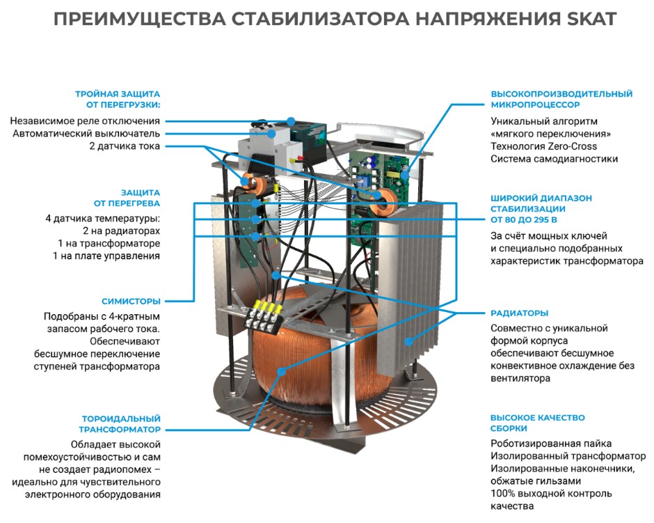 - корректировка напряжения с высокой точностью и плавностью перехода (9 ступеней переключения);- работа с расширенным диапазоном сетевого напряжения;- высокая точность и стабильность параметров за счет применения качественной элементной базы;- защитное отключение нагрузки при выходе напряжения сети за пределы рабочего диапазона;- защита питающей сети от перегрузки и короткого замыкания;- защита силовых ключей и трансформатора от перегрева;- противопожарная защита;- цифровая индикация напряжения, тока и мощности раздельно по входу и выходу;- индикация аварийных режимов: короткое замыкание, перегрев, выход напряжения за пределы диапазона;- бесшумная работа за счет использования конвективного охлаждения без применения вентиляторов;- возможность установки на стандартные кронштейны сплит-систем.