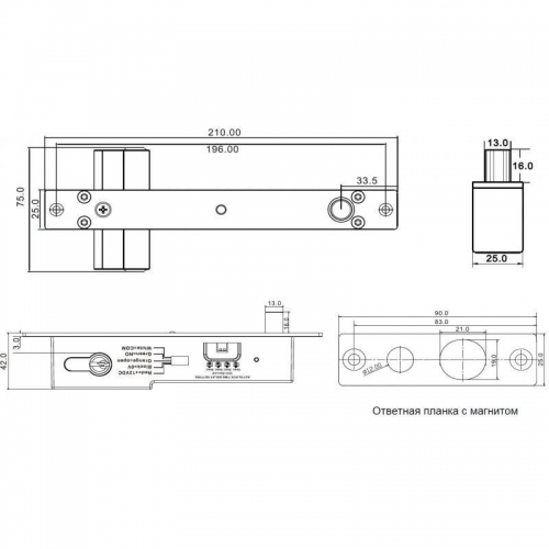 Функциональные особенности:● DB 500К - это полностью из металла нормально закрытый электроригельный замок.● Ригель имеет усилие удержания кг● Ригель выполнен из высококлассной нержавеющей стали● Запчасти из металла позволяют работать ригелю от до температуре● Надёжный магнитный клапан● Возможность установки цилиндра● Специальное фотоэлектрическое устройство управления● Схема защиты от вмешательства автоматически останавливает проверку магнитного геркона при запирании или вандализме● Умная схема проверяет правильность запирания● Установка задержки для автоматического запирания● Светодиоды показывают статус замка● Горизонтальный или вертикальный монтаж