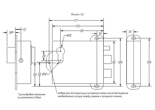 Накладной, универсальный. Снаружи и изнутри открывается ключом. Два засова. Переворот взводного кулачка. Задержка выхода засовов при взводе кулачка
