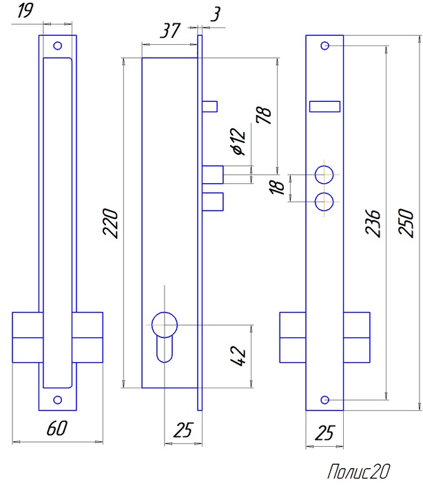 Врезной, узкий, вертикальный, универсальный, с блокировкой. Снаружи открывается ключом. Три засова. Переворот взводного кулачка. Задержка выхода засовов при взводе кулачка