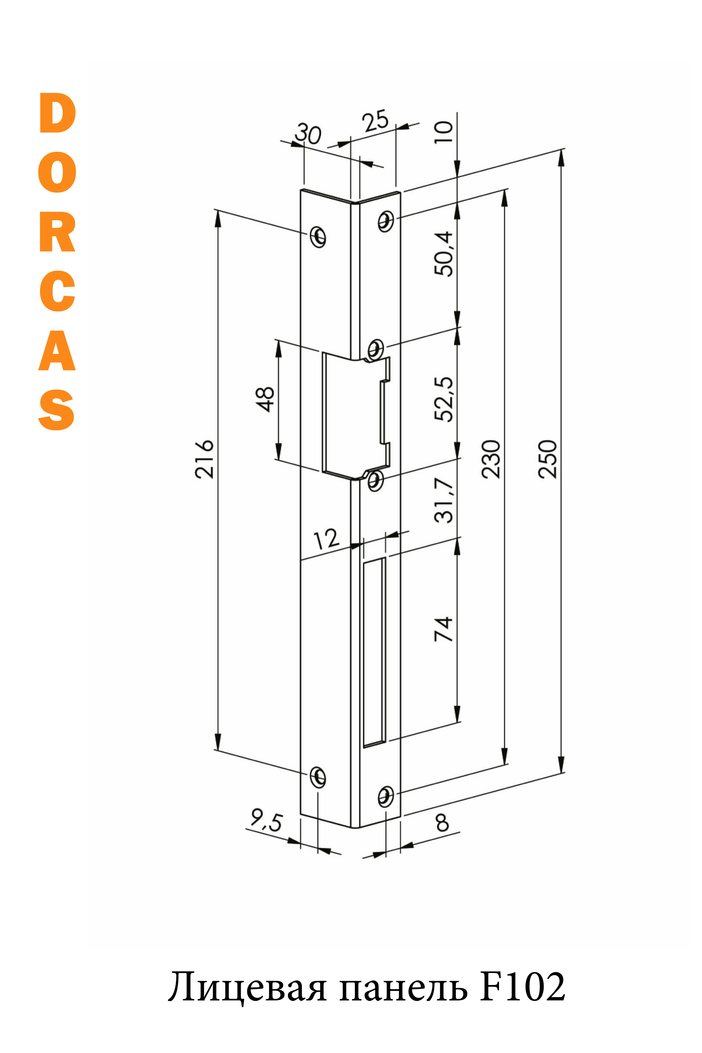 Угловая крепежная панель для электромеханической защелки, длинное исполнение 25х30x250x3 мм, прямые углы с 4 сторон,из нержавеющей стали.